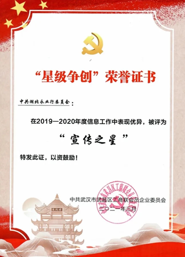 2021年3月26日,中共武昌区工商联会员企业委员会召开2021年度党建工作会议,中共湖北永业行委员会委员、永业行副总裁吴学锋参加会议。会上,中共湖北永业行委员会荣获2019-2020年度“宣传之星”党组织称号。