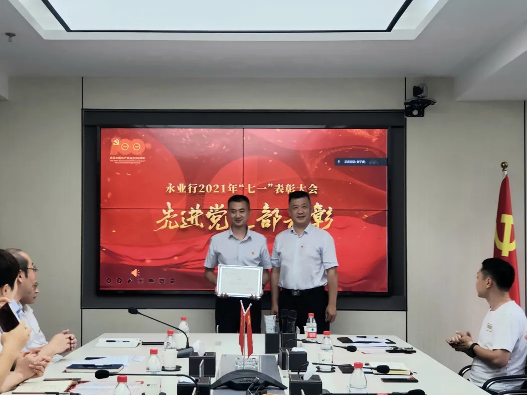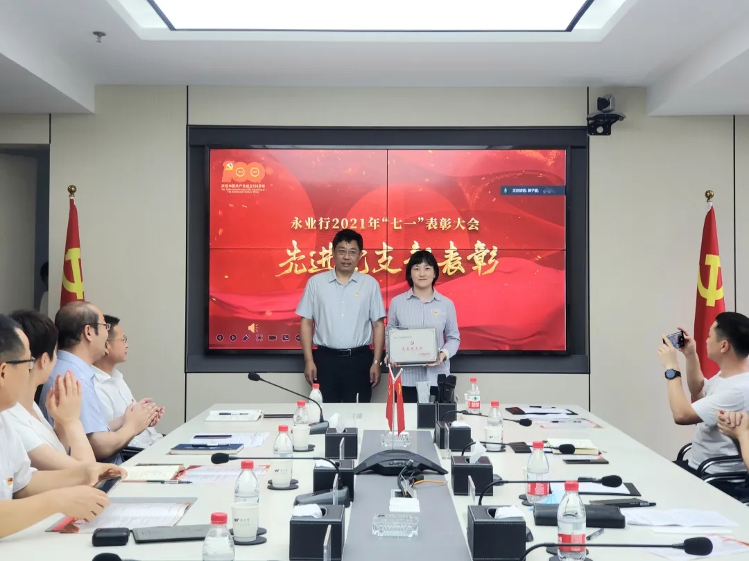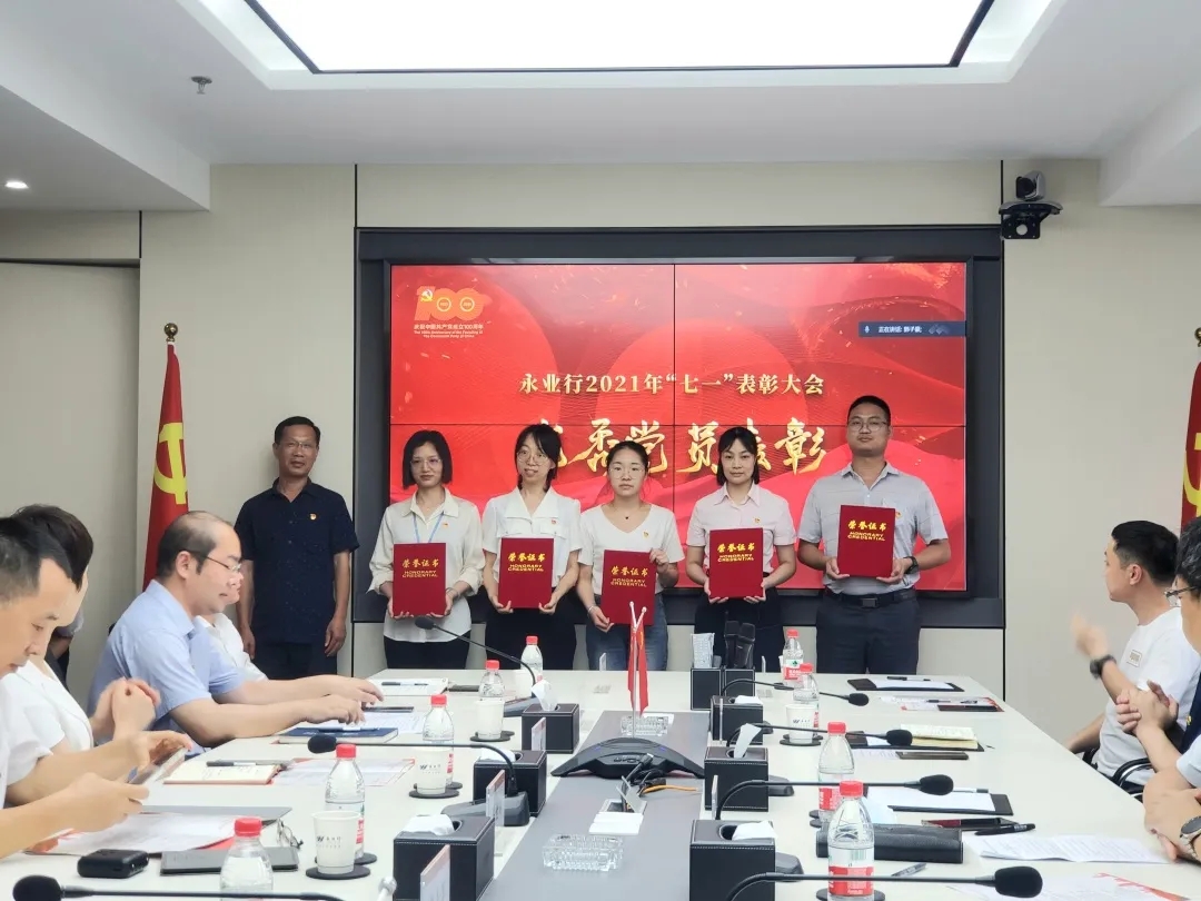 大会在雄壮的国歌声中拉开帷幕。永业行党委委员、副总裁雷小军、文云波分别宣读了《关于表彰2021年先进党支部的决定》《关于表彰2021年优秀党员的决定》,公司党委对自然资源党支部等3个先进党支部、刘亚玲等14名优秀共产党员进行了表彰并颁奖。
