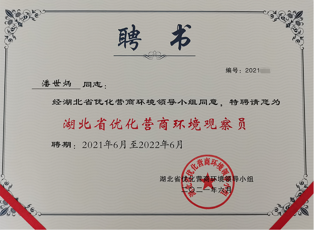 经湖北省优化营商环境领导小组公开选聘、省政府批准同意,近日,永业行董事长潘世炳受聘为湖北省首批优化营商环境观察员。