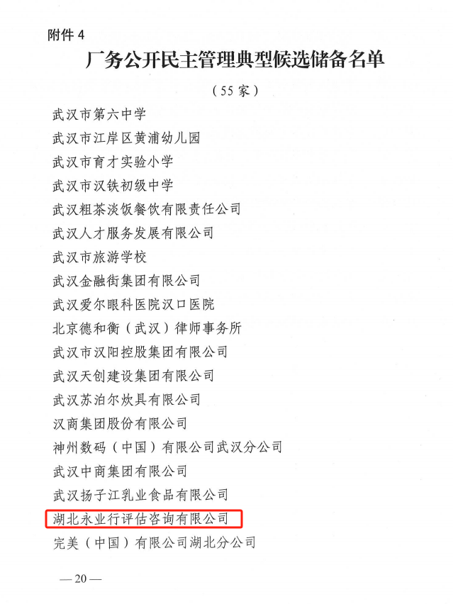 近日,武汉市总工会发布了关于2022-2024年度全市基层工会工作自查暨2024年全市企事业单位民主管理自查情况的通报,对湖北永业行评估咨询有限公司等55家厂务公开民主管理典型单位予以通报表扬,并列入下一步向全总、省总推荐的厂务公开民主管理典型的候选单位。