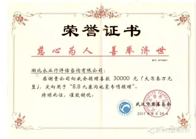 2017年8月8日21时,四川阿坝州九寨沟县发生7.0级地震,造成19人死亡,247人受伤。灾情牵动着全国人民的心。永业行集团在得知灾情后,迅速发起了“心系九寨沟”赈灾捐款活动,截止8月25日,总部及各分部员工通过现金捐赠、微信转账等方式,共计捐赠善款30000元。8月28日,公司助理总裁雷小军一行专程将募得的善款送到武汉市慈善总会,用于支持九寨沟地震救援和灾后重建。