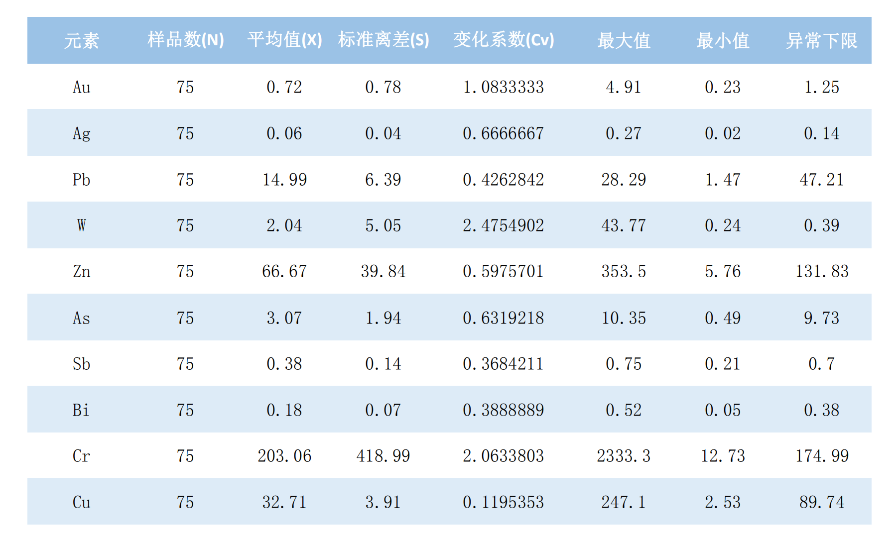 (1)均匀分布型(CV﹤0.3):Cu,说明其基本不受后期地质地球化学作用。