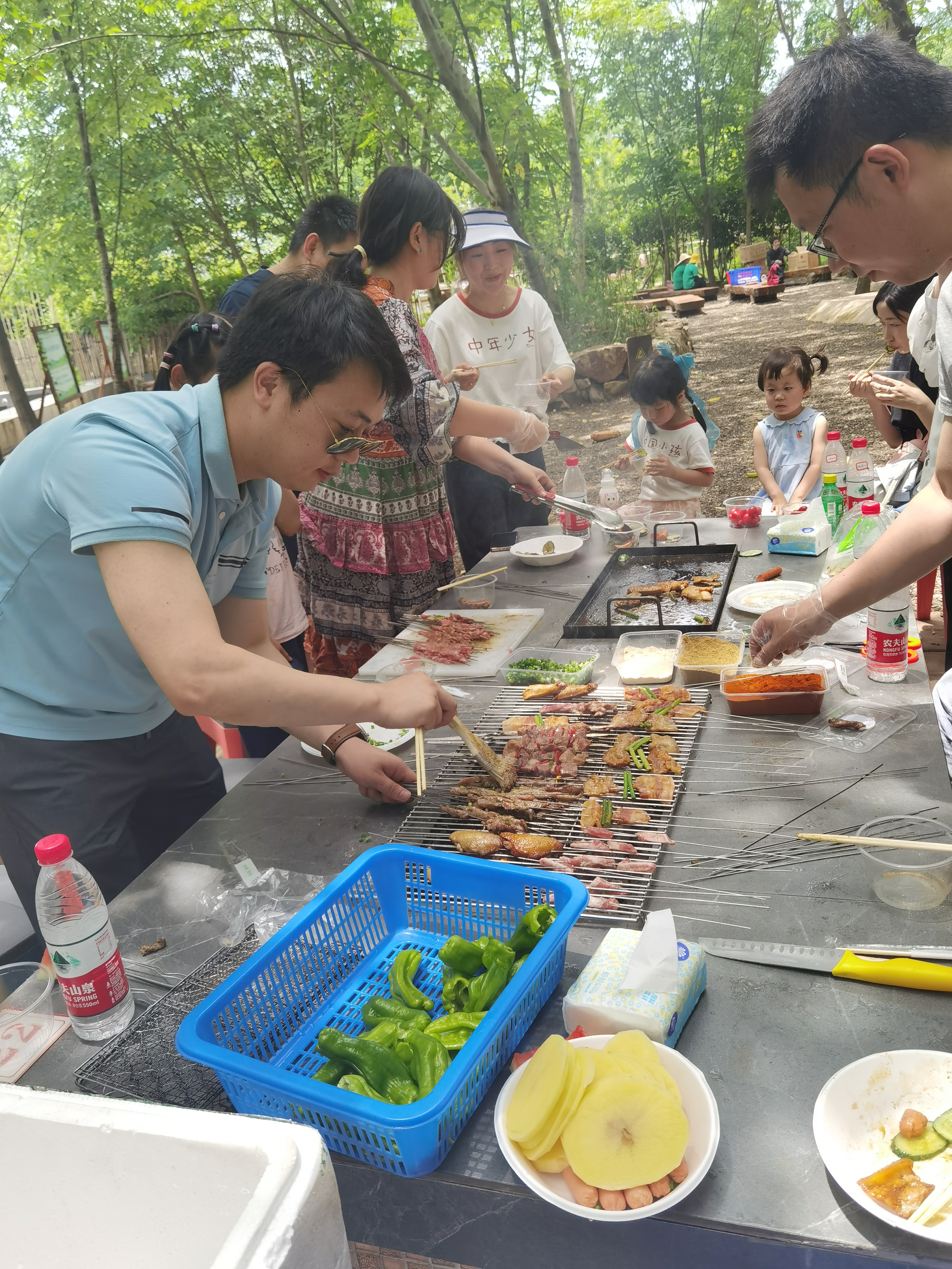 半天行程过后,在孩子们充满快乐和期盼的眼神中,烧烤活动正式开始。在家长们的帮助下,孩子们配合默契,一个个化身成“劳动小能手”,架炉子、涮调料、摆桌子、串食材,一时间热火朝天,大家忙得不亦乐乎却有条不紊。大小朋友们围坐在一起,吃着烤串,闲话家常,开怀大笑,各种美味香气萦绕在空气中,场面热闹而欢快!