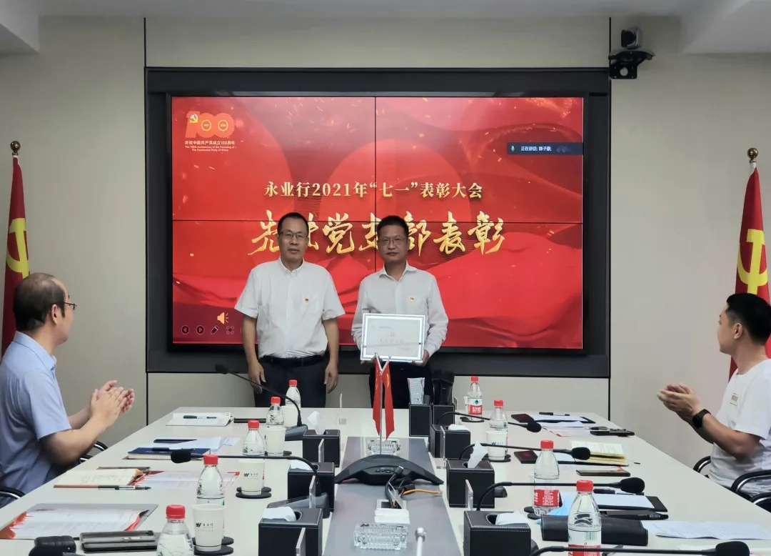 大会在雄壮的国歌声中拉开帷幕。永业行党委委员、副总裁雷小军、文云波分别宣读了《关于表彰2021年先进党支部的决定》《关于表彰2021年优秀党员的决定》,公司党委对自然资源党支部等3个先进党支部、刘亚玲等14名优秀共产党员进行了表彰并颁奖。