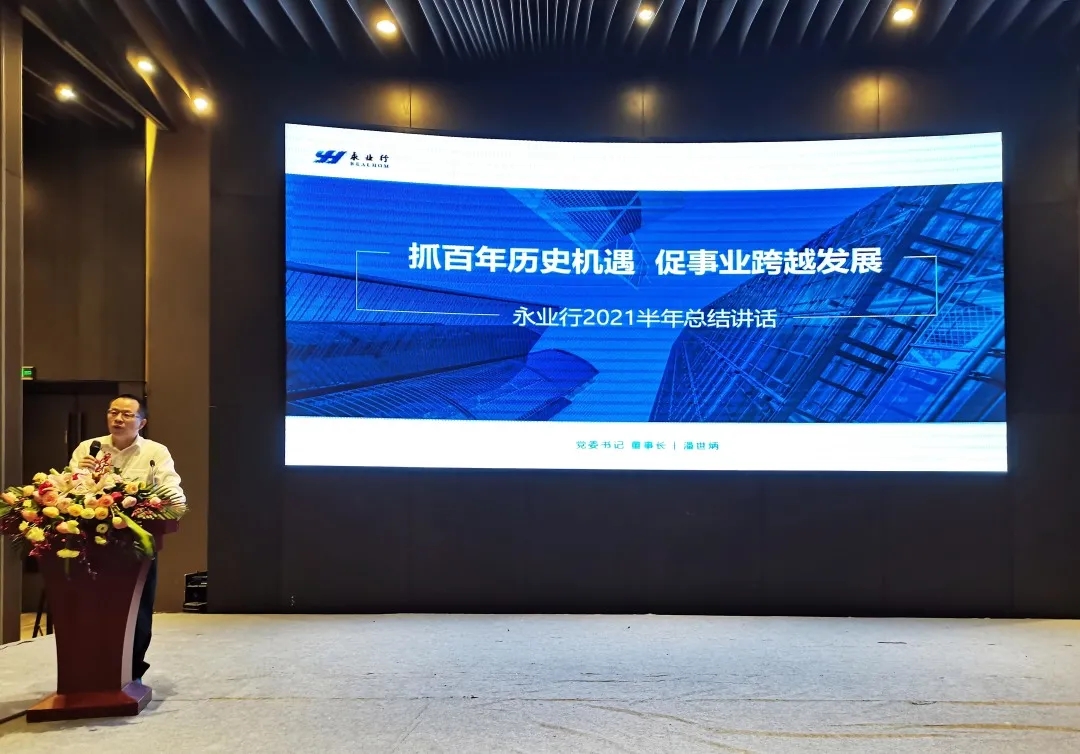 党委书记、董事长潘世炳在会上作主题为《抓百年历史机遇  促事业跨越发展》的讲话。他结合国内外宏观经济形势带来的重大机遇,深刻分析了永业行面临的发展机遇和挑战,从“形势带来的重大机遇、升级经营管理体系、补齐短板突破瓶颈、提高认识切实行动”等方面对下半年工作开展做了明确规划部署。他强调,中高层管理人员要秉承“五位一体”管理理念,不断提升眼界高度和“三个引领”能力,加强对公司战略和制度的理解、传递与执行,围绕“业务创新、管理创新、结构创新”主线,夯实管理基础、整合技术优势、深挖市场潜力、强化团队建设、筑牢风控防线,切实有效的提升公司核心竞争力,持续扩大永业行品牌影响力,全力助推永业行实现高质量跨越式发展。