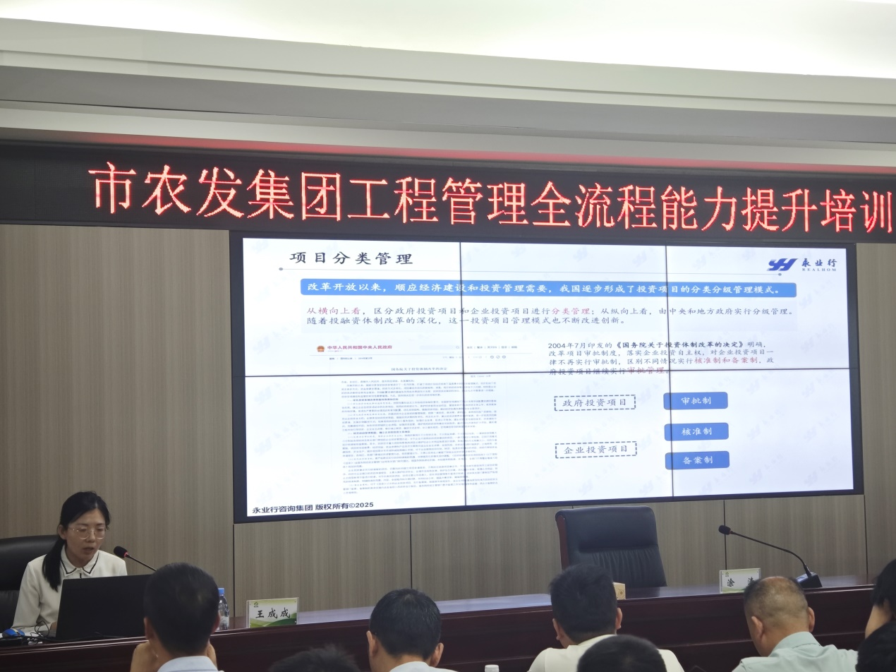 2025年5月12日,潜江市农业发展集团有限公司组织召开“市农发集团工程管理全流程能力提升培训会”,市农发集团副总经理涂涛主持会议。永业行投资金融事业群工程咨询事业部总监王成成受邀作《建设项目全流程管理》专题培训。