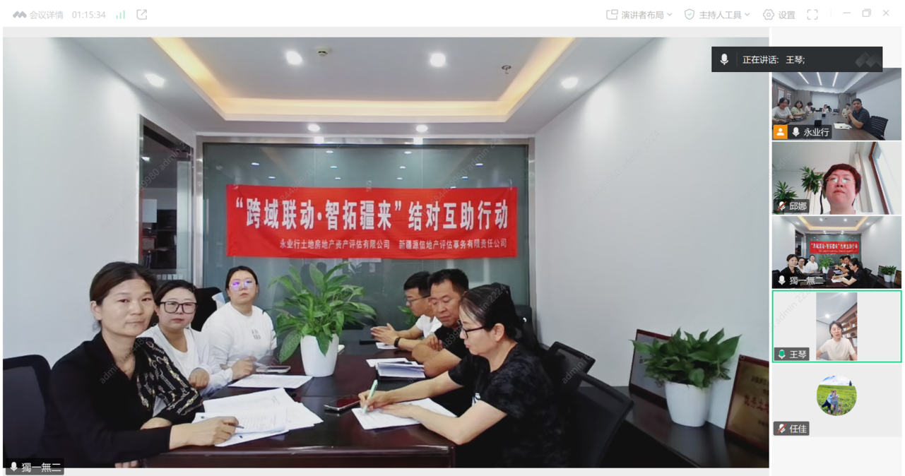 为深入贯彻中估协土地估价行业结对互助工作部署,推动行业资源整合与协同发展,2025年7月2日,永业行与结对互助机构新疆源信地产评估事务有限责任公司(以下简称“新疆源信”)以视频连线形式召开座谈会,共同启动“跨域联动 智拓疆来”结对互助行动。永业行联席总裁王琴,新疆源信副总经理邱娜、技术总监辛菊芳等参加交流。永业行技术副总监、技术中心总经理李冀云主持会议。