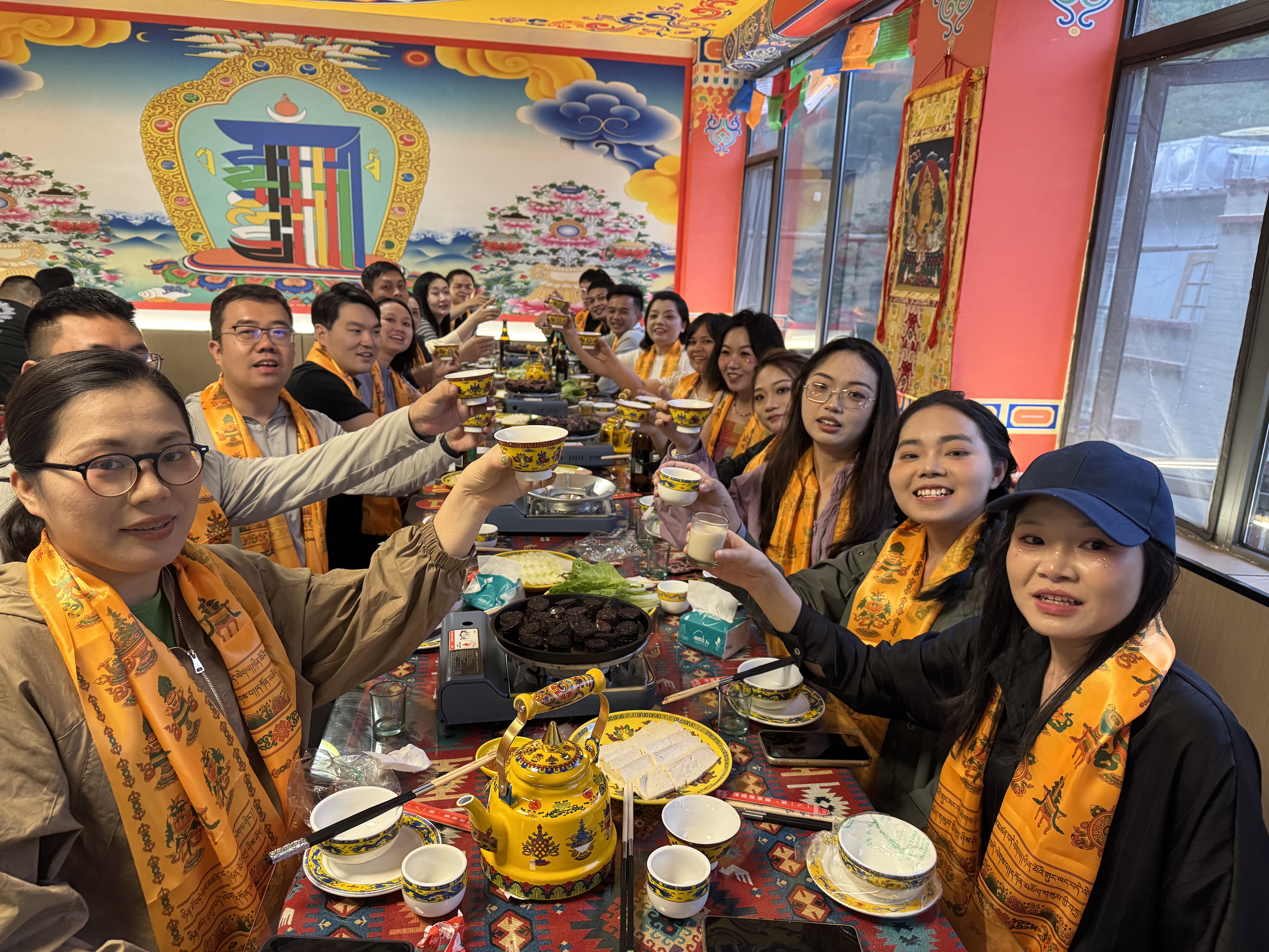夜幕降临,特色藏餐为旅程增添别样热闹。品青稞酒、跳锅庄舞、听藏族歌,小伙伴们热情邀请藏族朋友同跳海南民族传统舞蹈“儋州调声”,同唱“请到天涯海角来”。欢快的舞步与嘹亮的歌声交融,现场一片欢腾。不同地域民族文化碰撞融合,不仅加深了彼此的情谊,更让团队成员深刻感受到文化多元的魅力。
